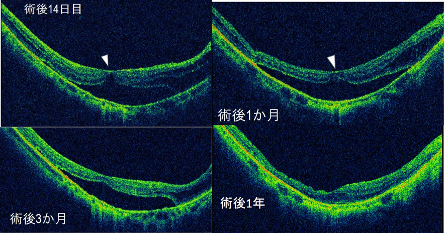2010年にMichalewskaらにより円孔径400μm以上の大型の黄斑円孔に対する内境界膜翻転法を併用した硝子体手術が報告され、その後強度近視眼に併発する黄斑円孔網膜剥離にも本法が用いられるようになりました。従来黄斑円孔網膜剥離では内境界膜を広範囲に剥離除去し、術後は網膜が復位したのちに円孔閉鎖が得られました。しかし当院及び大阪大学附属病院にて黄斑円孔網膜剥離に対し内境界膜翻転法を行った症例の中で、網膜下液が残存した状態で円孔閉鎖が得られた症例を3例認めました(図5)。これらの症例では術中に網膜下液の排除は行っておらず、網膜復位に先立ち翻転され円孔間を架橋した内境界膜により円孔閉鎖が開始しています。その後架橋した内境界膜の直下からグリアと思われる細胞の増殖により網膜内層の閉鎖が完成し、徐々に網膜下液が消失して網膜復位を得ました(図5)。Michalewskaらは大型黄斑円孔の閉鎖において、翻転した内境界膜がグリア細胞の増殖の足場となり、円孔内が増殖した細胞で満たされ円孔閉鎖を促している可能性があると推察していますが、我々の経験したMHRDの円孔閉鎖過程とまさに一致しており、彼らの仮説を支持している可能性が示唆される。また黄斑円孔閉鎖のプロセスそのものが、必ずしも網膜復位により惹起されるものではないという可能性が考えられ、その結果を下記のように報告しました。