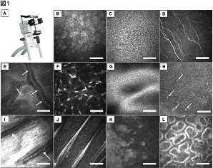 A:装置の外観。 B:角膜上皮最表層(Bar=100μm、以下同様)。C:角膜上皮基底細胞層。D:ボウマン層と角膜上皮下神経叢。E:ボウマン層と角膜実質の境界面領域に観察される角膜実質コラーゲン線維の終末部と考えられる構造(矢印)(K-structure)。F:角膜実質。G:角膜内皮層。 H:正常結膜とゴブレット細胞(矢印)。I:テノン嚢内を走行する血管(矢印)。J:Palisade of Vogt。K: 角膜輪部では、やや高輝度な結膜と低輝度の角膜上皮細胞との移行部がモザイク状に観察される。L:マイボーム腺。