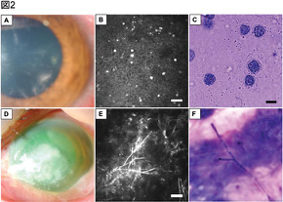 A: ソフトコンタクト使用者に見られた角膜炎。上皮下混濁と放射状角膜神経炎を認めた。B: レーザー共焦点顕微鏡では、上皮基底層のレベルに、円形(直径10-20μm)で高輝度のアメーバシストを多数確認できた。Bar=50μm。 C: パーカーインクKOH染色では多数のアメーバシストが検出された。Scale=10μm。 D: 角膜真菌症の1例。E: レーザー共焦点顕微鏡では、多くの菌糸が確認された。Bar=50μm。 F: 鏡検にても同様の菌糸が確認され、アスペルギルスによる感染と考えられた。