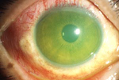 図5 A:急性期酸外傷に対して羊膜カバーを行った症例。初診時(受傷4日目)、広範な角膜結膜上皮の欠損を認めた。